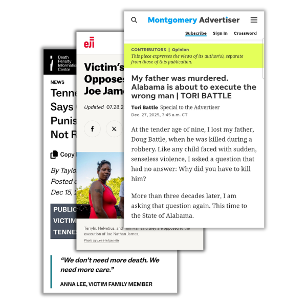 - Anna Lee urged Tennessee Governor Bill Lee to end the death penalty arguing that it diverts state-funded resources away from services that would actually support meaningful healing for victims and survivors, including herself. (Read More)